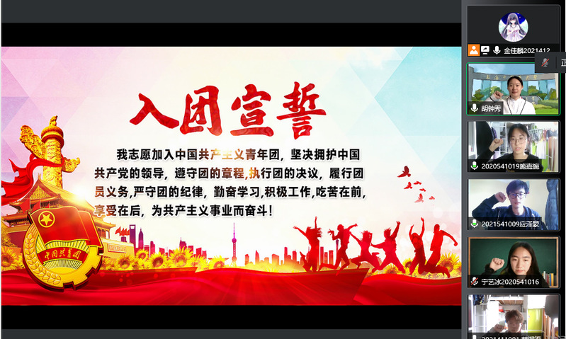 为庆祝中国共产主义青年团成立100周年,全面贯彻习近平新时代中国特色社会主义思想,深入学习贯彻习近平总书记在中国人民大学考察时的重要讲话精神,引导广大团员青年厚植爱国情怀,以实际行动迎接党的二十大召开,5月1日,在“五四”青年节到来之际,工口实验室 团委组织开展“入团云宣誓”仪式。5名新发展的团员庄严宣誓,其他与会团员重温了入团誓言。